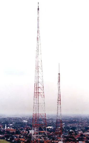 Rohn Products International was the sales representative during the period of time Rohn was owned by Radian Communications and was involved in the sale of a 395m (1295ft.) Hybrid Guyed Self Supporting tower to support a UHF Television Antenna System at their main transmission site in Jakarta, Indonesia.